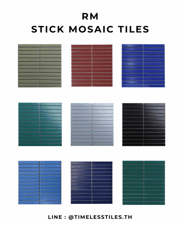 กระเบื้องโมเสกแท่งขนาดเล็ก (Strip Mosaic) จัดเรียงบนแผ่นสำเร็จรูปขนาด 295×280 มม. เพื่อความสะดวกในการติดตั้ง พร้อมดีไซน์ที่ให้ความรู้สึกทันสมัย และดูมีเลเยอร์ในทุกมุมมอง