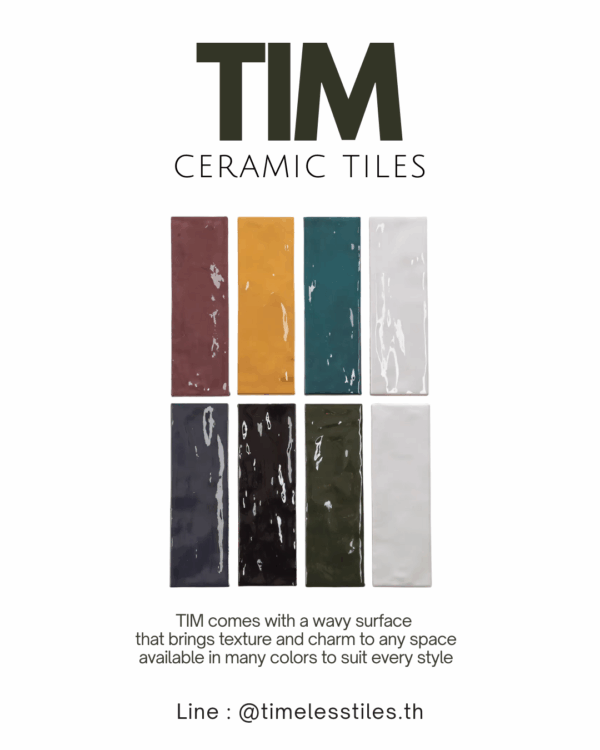 กระเบื้อง TIM CERAMIC TILES มาพร้อมดีไซน์ที่เรียบง่ายแต่มีเอกลักษณ์ ด้วยผิวเงาที่สะท้อนแสง และพื้นผิวที่แตกต่างในแต่ละแผ่น ทำให้เหมาะกับการตกแต่งพื้นที่ที่ต้องการความรู้สึก “อบอุ่น มีชีวิต และไม่จำเจ”