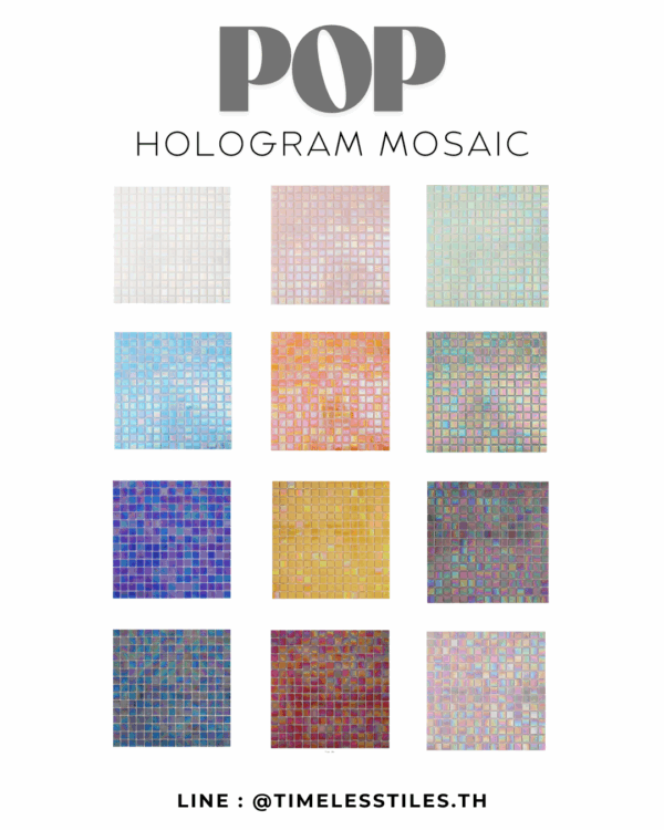 สะท้อนความสนุกของแสง สี และพื้นผิวด้วยกระเบื้องโมเสก POP HOLOGRAM MOSAIC TILES กระเบื้องโมเสกผิวเงา ที่โดดเด่นด้วยเอฟเฟกต์แบบ โฮโลแกรม (Hologram) ที่เปลี่ยนเฉดสีไปตามมุมมองและแสงที่ตกกระทบ
