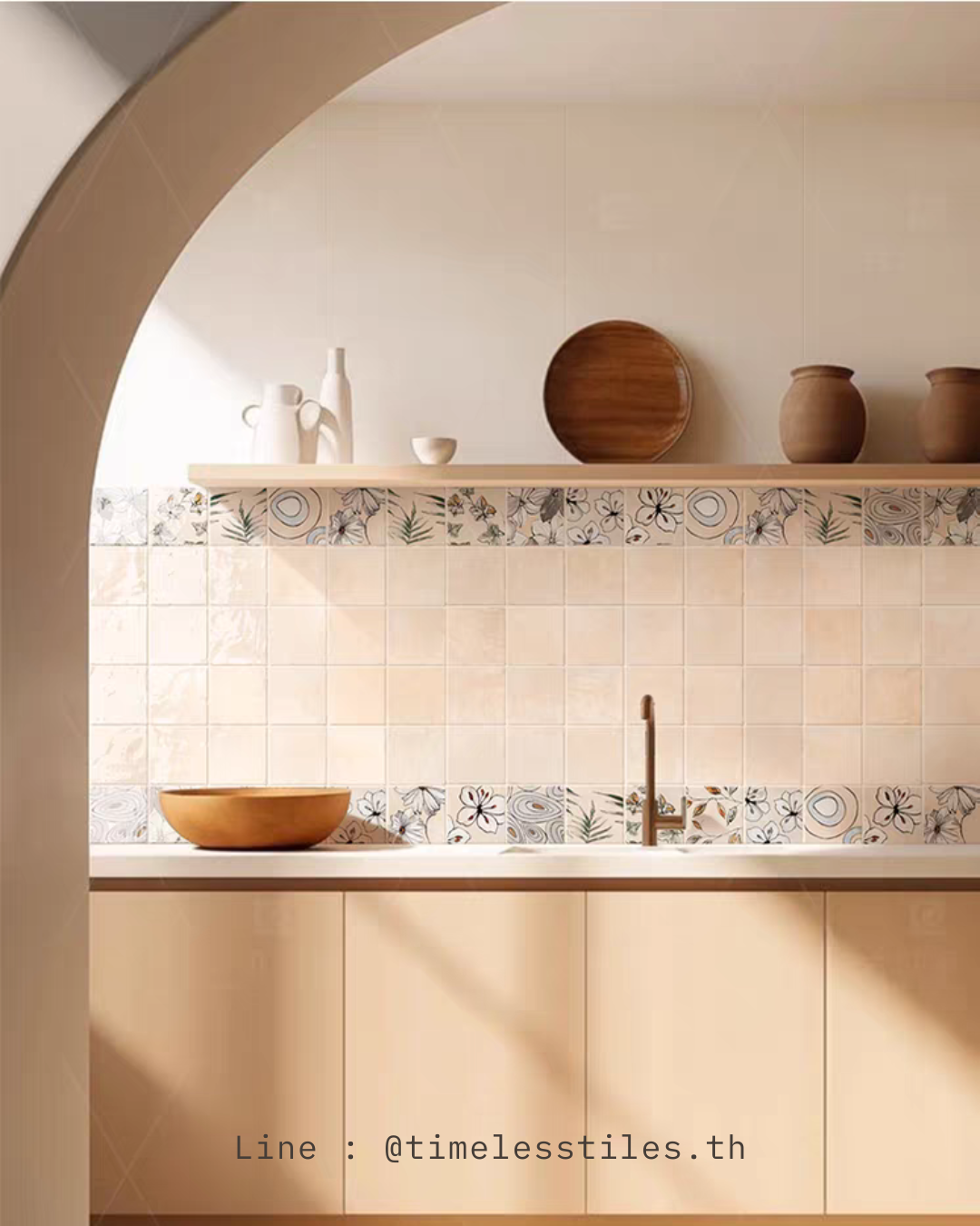 สร้างความสดใสให้พื้นที่ใช้งานประจำวัน ด้วยการจับคู่กระเบื้องสีพื้นกับลายดอกไม้สลับกันเป็นจังหวะ หรือติดเป็นกรอบลวดลายเฉพาะบางจุด เช่น รอบกระจก หรือหลังเตา เพิ่มความละเมียดละไมแบบวินเทจโดยไม่ดูเยอะจนเกินไป เหมาะกับการเปลี่ยนผนังธรรมดาให้กลายเป็นจุดเด่นที่สะท้อนความใส่ใจ
