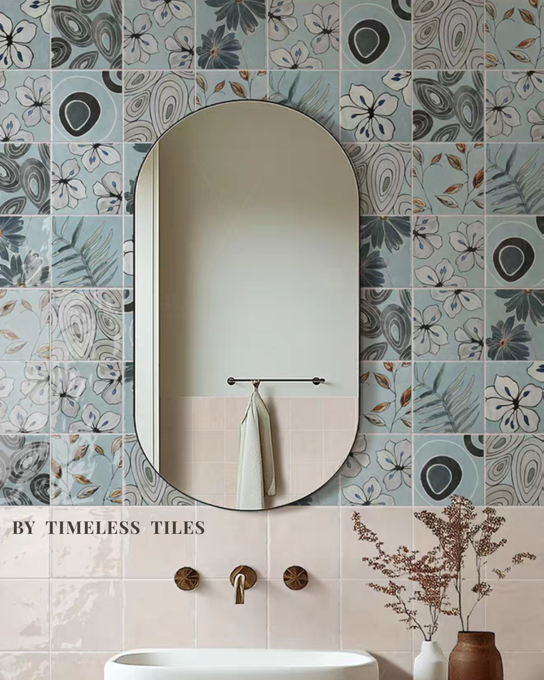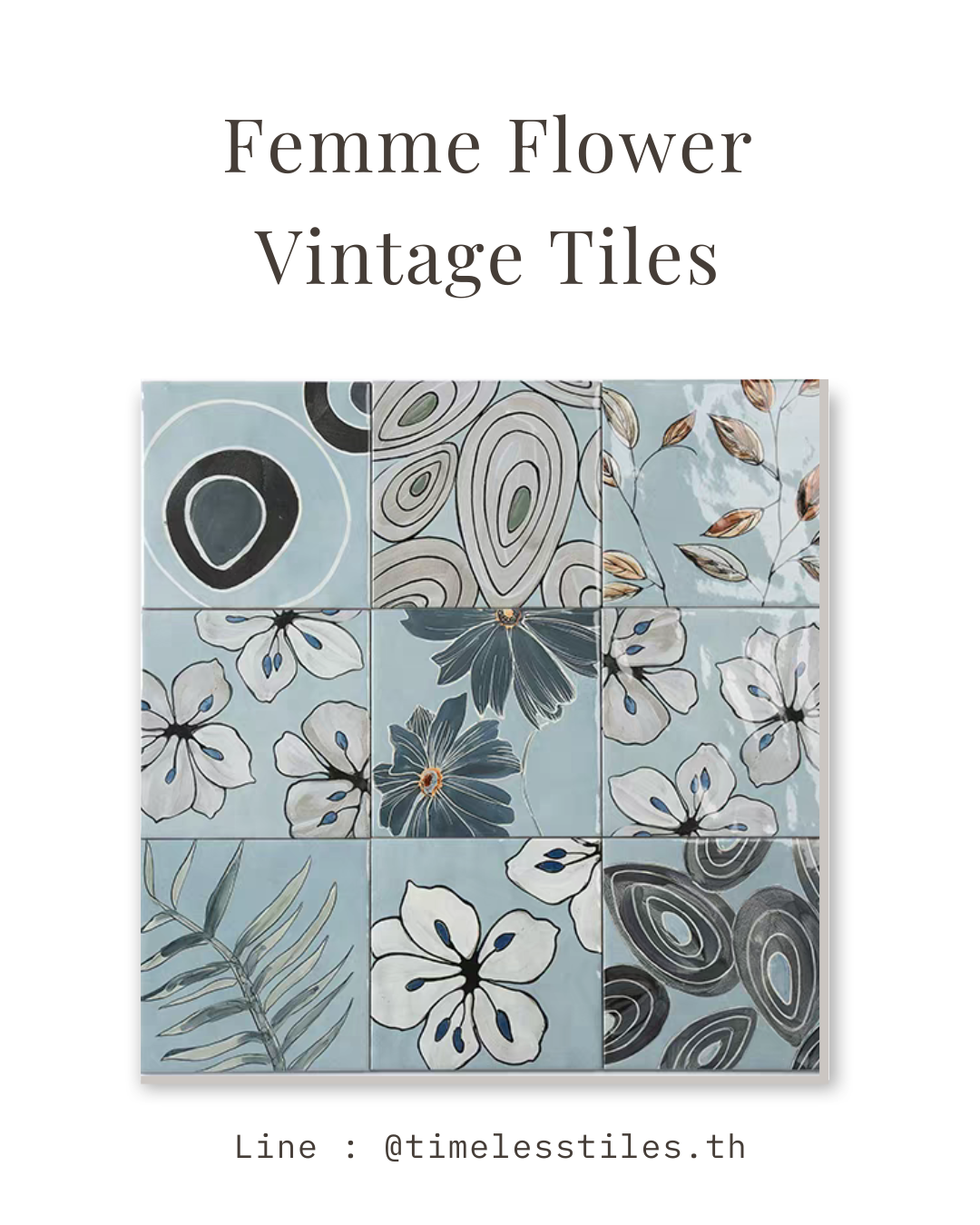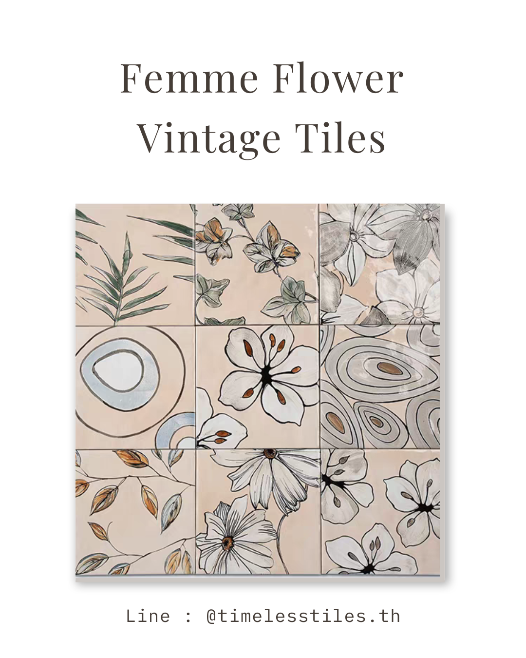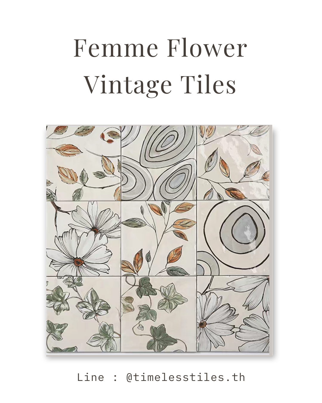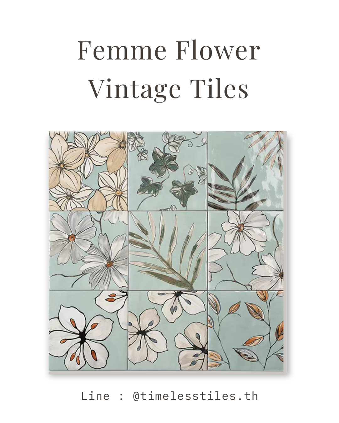 ด้วยลวดลายดอกไม้และเฉดสีพาสเทลอ่อนหวาน กระเบื้องชุดนี้เหมาะอย่างยิ่งกับการแต่งห้องในสไตล์วินเทจที่ให้ความรู้สึกเหมือนย้อนยุคแบบร่วมสมัย