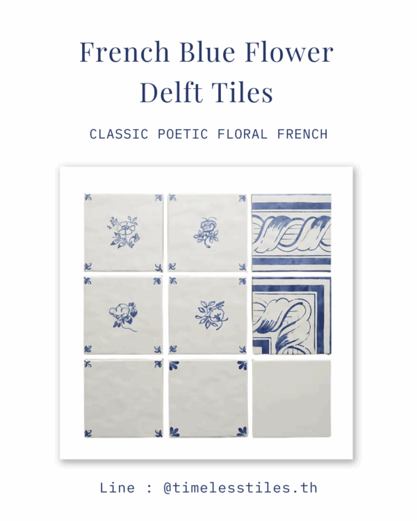 กระเบื้องเซรามิก ลายดอกไม้โทนฟ้า–ขาวในสไตล์ Delft ให้บรรยากาศแบบ French country ที่อบอุ่นและมีความคลาสสิก