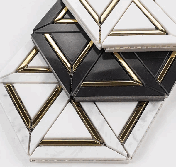 A decorative tile that harmoniously combines the timeless charm of natural marble with the refined shimmer of 304 stainless steel. With its precisely aligned triangular geometric design, each piece of Grace Mosaic Tiles becomes a piece of wall art. The subtle reflections from the metallic edges add dimension and depth, transforming your space into one that feels modern, elegant, and tastefully radiant.